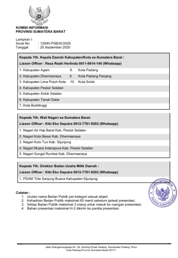Tahap presentasi akan dilaksanakan di Gedung Komisi Informasi Provinsi Sumatera Barat pada Selasa, 07 Oktober 2025. Agenda ini menjadi kesempatan penting bagi Nagari Koto Besar untuk menunjukkan komitmen, inovasi, serta strategi dalam memberikan pelayanan informasi yang transparan dan akuntabel kepada masyarakat.